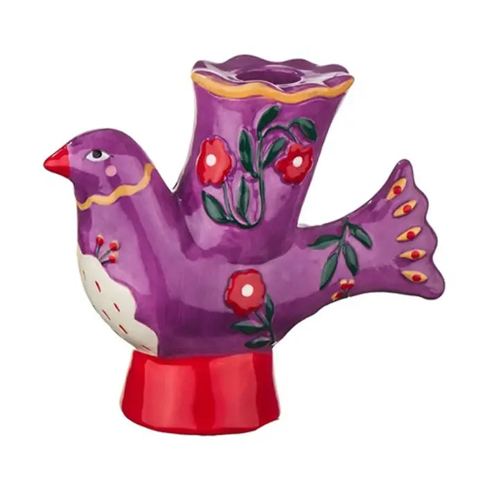 Ben je op zoek naar een bijzondere kandelaar met karakter? Dan is deze vogel kandelaar in paars met rood of blauw met geel een stijlvolle keuze die sfeer, kleur en ambacht samenbrengt in één ontwerp.