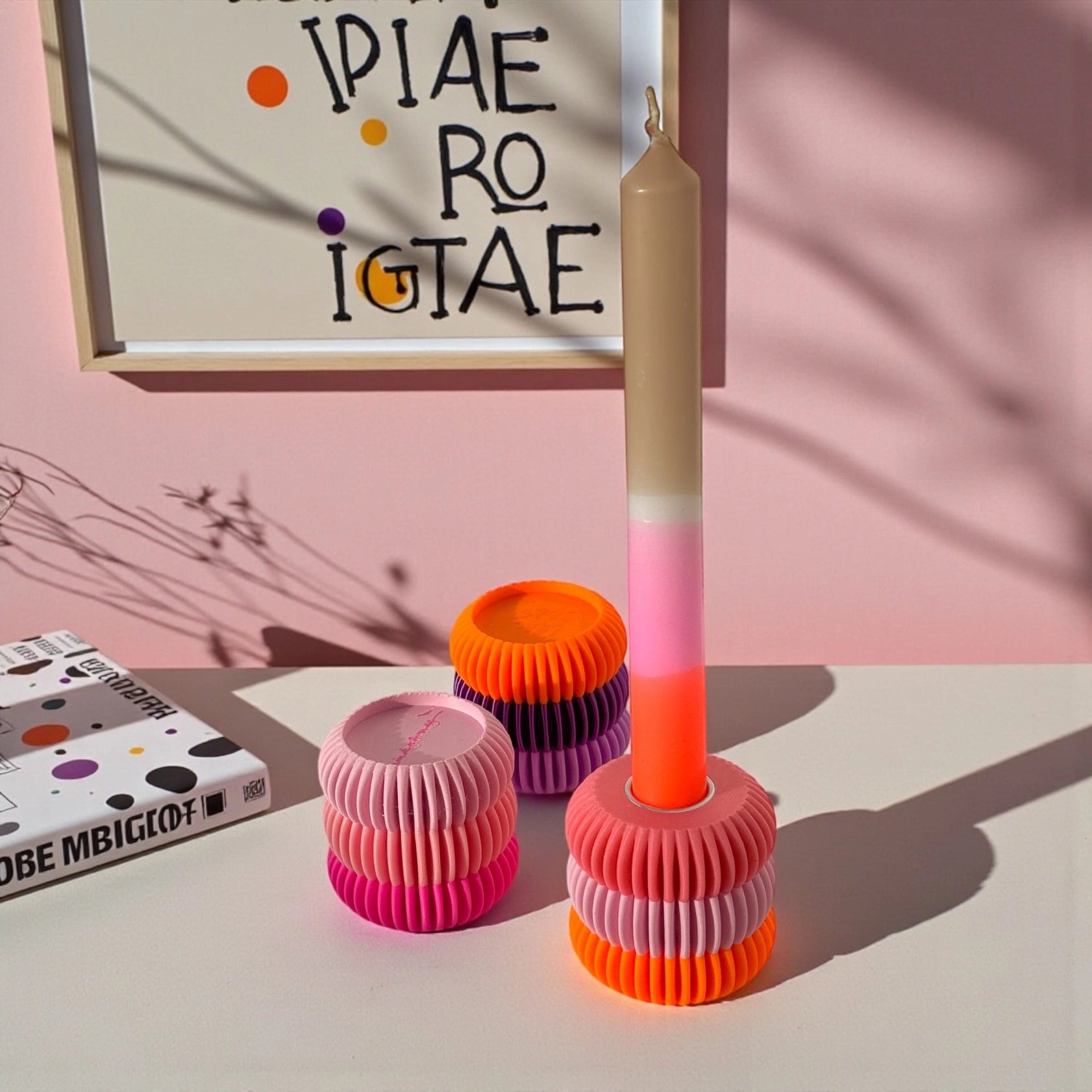 Deze kandelaar met ronde vormen is klein van formaat, maar groots in uitstraling. Een speels ontwerp waarin kleur, vorm en functionaliteit samenkomen. Elke kandelaar bestaat uit drie felle kleuren die samen één krachtig geheel vormen. Denk aan combinaties die elkaar versterken, contrasteren en juist daardoor opvallen. Dit is geen subtiele basic – dit is een statement in mini-formaat.